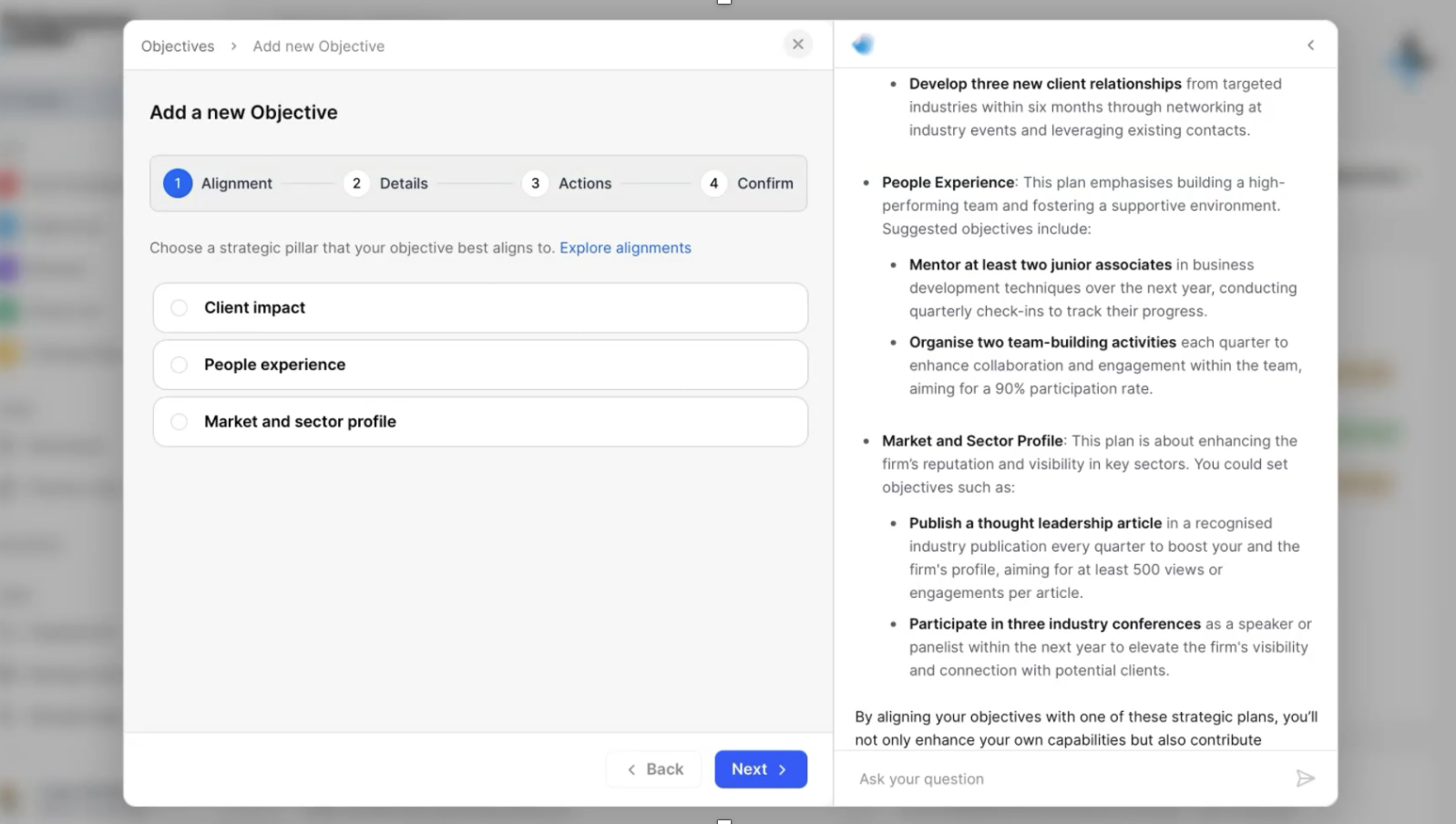We've embedded our objective-setting AI assistant to guide your partners and employees through the objective setting process: from alignment, to crafting the objective and determining actions.