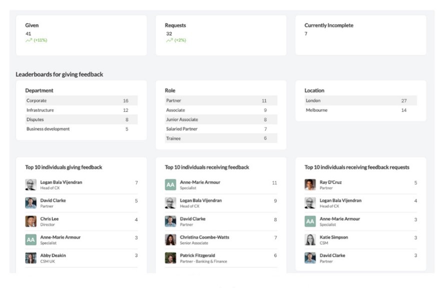Earlier this year, to recognise those who contribute the most to building a feedback culture, we released a major update to our Fast Feedback reporting dashboard, as shown below. It shows feedback giving and requesting trends over time and identifies the top contributors. This helps leaders to understand feedback behaviour and the effectiveness of feedback campaigns, and highlights people who are driving the feedback culture – including many hidden heroes.